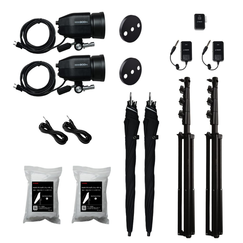 MONO300N×2、パラソルPK-105×2、パラソルディフューザーL×2、ライトスタンドPS-300×2、FM送受信機III×1、FM受信機(FM送受信機III16CH用)×1